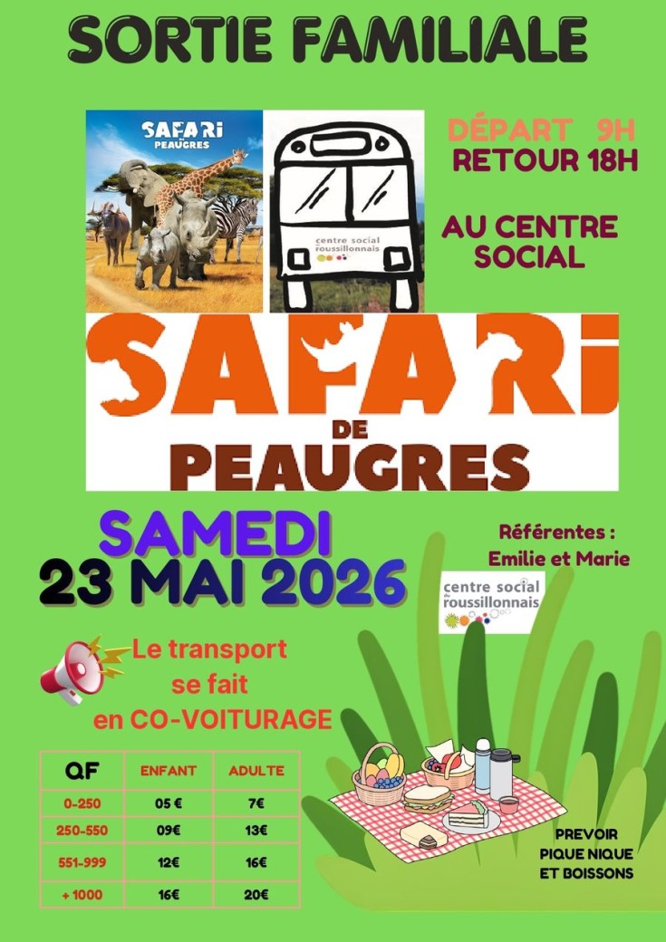 Sortie familiale au Safari de Peaugres : une journée en famille au Safari de Peaugres, le samedi 23 mai 2026. Départ à 9h depuis le centre social, retour à 18h. Transport en co-voiturage. Tarifs selon quotient familial : 5 à 20 € (enfant/adulte). Prévoir un pique-nique et des boissons. Renseignements auprès d’Émilie et Marie.
